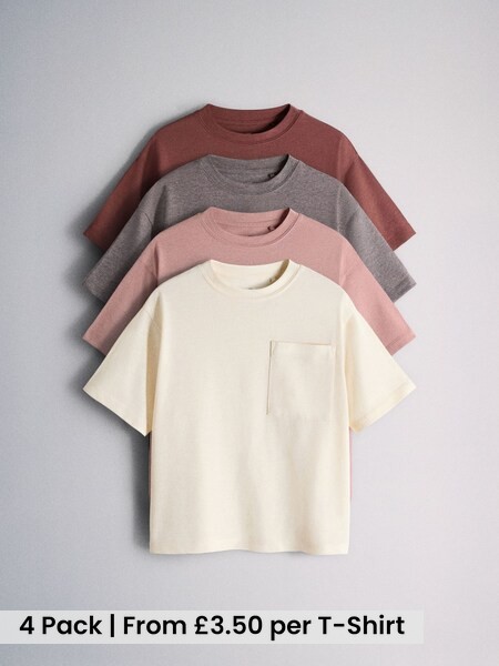 4 Pack Short Sleeve Cotton Blend Oversized Pocket T-Shirts Brown/Red/Pink/Cream