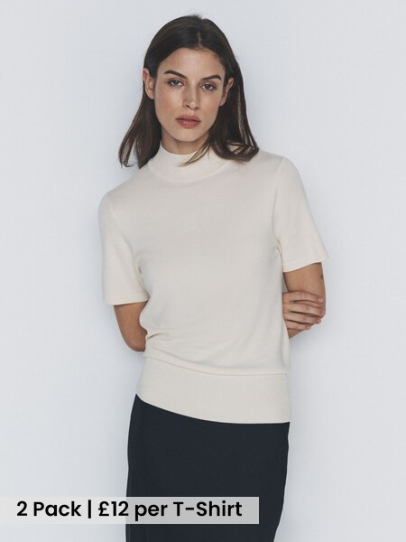 2 Pack High Neck Knit T-Shirts Cream/Navy Blue