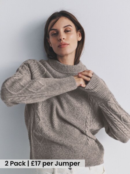 2 Pack Knitted Cable Jumpers With Wool Cream/Light Brown Marl