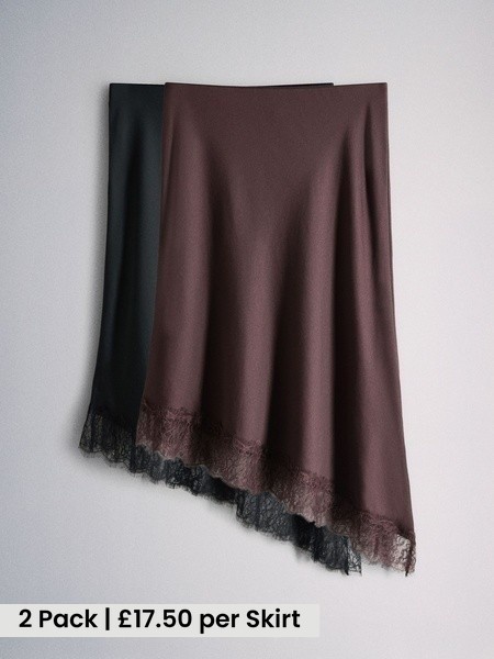 2 Pack Satin Crepe Lace Hem Asymmetric Midi Skirts Black/Plum