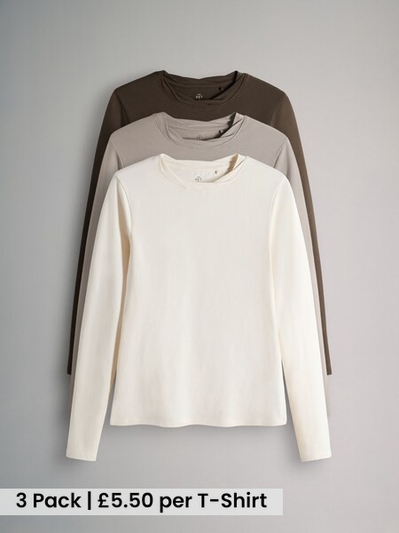 3 Pack Twist Neck Long Sleeve T-Shirts Chocolate Brown/Taupe Brown/Cream