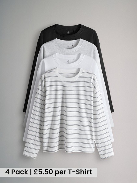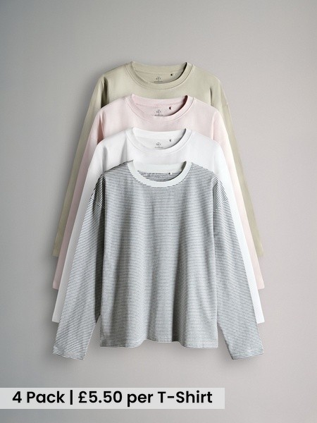 4 Pack 100% Cotton Relaxed Long Sleeve T-Shirts Light Green/Pink/White/Stripe Relaxed Fit