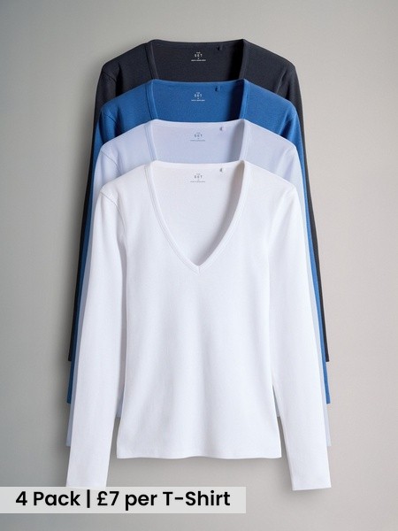 4 Pack V-Neck Ribbed Long Sleeve T-Shirts Navy/Blue/Light Blue/White
