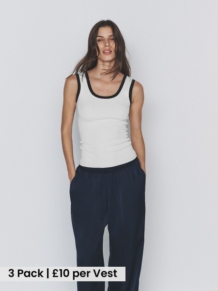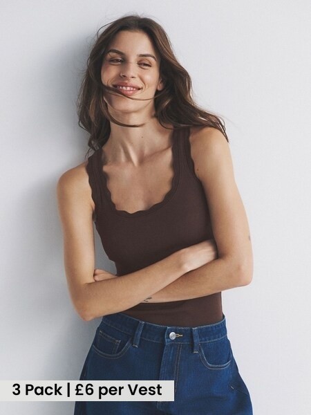 3 Pack Scallop Trim Ribbed Vest Black/Chocolate Brown/White