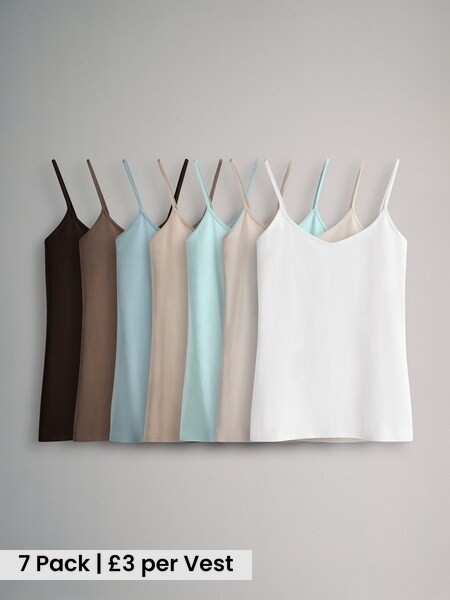 7 Pack Thin Strap Vest Tops Chocolate Brown/Cream/White/Blues