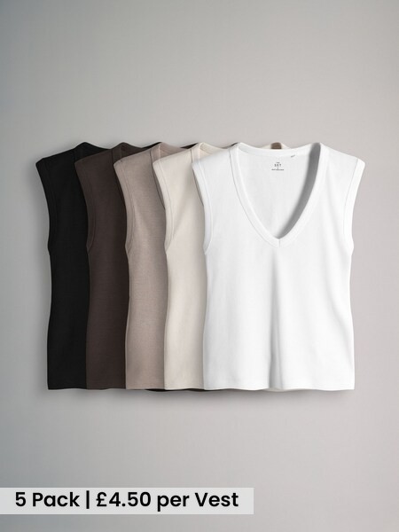 5 Pack Deep V-Neck Ribbed Vest Chocolate Brown/Pink/White
