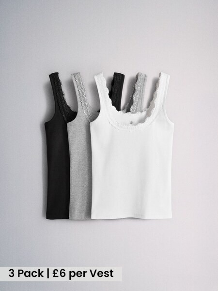 4 Pack Square Neck Lace Trim Ribbed Vest Black/Grey/White