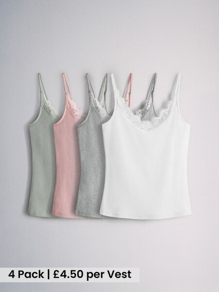 4 Pack Ribbed Lace Trim Cami Vest White/Grey/Pink/Green